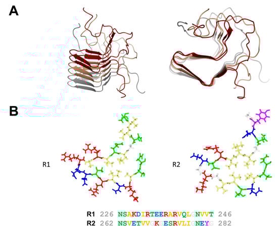Amyloid fold of the HET-s prion forming domain. (A) Lateral and axial view of a trimer of HET-s (218–289) in its fibrillar amyloid conformation. Each monomer is given in a different color (PDB entry 2RMN). (B) Structure of the R1 and R2 repeats of HET-s (218–289) given together with the corresponding amino acid sequence. Polar residues are colored in green, hydrophobic residues in yellow, positively charged residues in red, negatively charged residues in blue, aromatic residues in magenta and glycine in white.