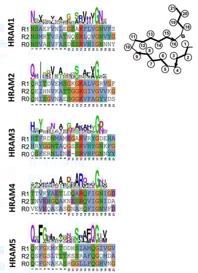 Sequences and motif signatures of the different Het-s-related-amyloid motifs (HRAM) subfamilies. For each of the five HRAM subfamilies, for one representative example, sequences of the R1, R2 and R0 sequences are given as well as the general motif signature (given as a consensus sequence logo). The proteins chosen as examples are respectively: Fusarium graminearum I1S1J5 and I1S1J6 for HRAM1, Penicillium roqueforti W6Q0M1 and W6PZN6 for HRAM2, Cladophialophora psammophila W9WR11 and W9XJW2 for HRAM3, Pestalotiopsis fici W3WR35 and W3WR59 for HRAM4 and P. anserina B2B1E9 and A0A090CH31 for HRAM5.