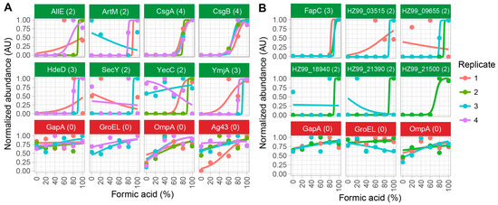 The identification of functional amyloid candidates in cell lysates of (A) Escherichia coli SM2258 and (B) Pseudomonas sp. UK4. Proteins with amyloid-specific abundance signatures in at least two biological replicates are shown with green titles. Negative controls are shown in red titles, which include the household proteins, Glyceraldehyde-3-phosphate dehydrogenase A (GapA) and 60 kDa chaperonin (GroEL); and β-barrel outer membrane proteins, like outer membrane protein A (OmpA) and antigen 43 (Ag43). The numbers in the parentheses indicate the number of biological replicates in which the proteins were classified as amyloid candidates based on the fitting parameters. Notice that some data points and curves are hidden as they overlap, and some proteins were not observed in all replicates.