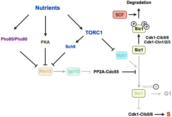Figure 2. The Greatwall–Endosulfine–PP2A-B55 pathway connects TORC1 with the stability of the Cdk1 inhibitor Sic1 in budding yeast. Sic1 stabilization in poor nutrients requires the phosphorylation of Sic1 promoted by the Mpk1 kinase and by the Rim15–Igo1/2-dependent inactivation of PP2A-Cdc55. S: S-phase. SCF: Skp1–Cul1–F-box protein.