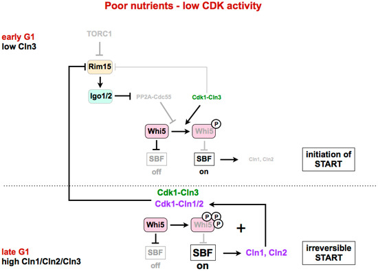 Recently, it has been shown that the Greatwall–Endosulfine pathway could also be regulating START in budding yeast [77]. Similarly to other eukaryotes, in S. cerevisiae, Cdk1 activity is required for the G1/S transition. In budding yeast, Cdk1 associated with the G1 cyclin Cln3 determines the cell size at START and helps to trigger the expression of late G1 cyclins Cln1 and Cln2. In late G1, all three cyclins, Cln1, Cln2 and Cln3, collaborate to make START transition irreversible. However, the current model does not explain why, under nutrient limitation and despite the lower levels of Cdk1–Cln3, budding yeast cells pass START at a smaller cell size. The key CDK substrate that needs to be phosphorylated for G1/S transition is Whi5 (functionally related to mammalian Rb), which, in its dephosphorylated form, is a repressor of SBF (E2F in mammalian cells), a transcription factor required for START. The inhibitory phosphorylation of Whi5 is carried out by Cdk1–Cln1,2,3, and is reversed by PP2A-B55. Talarek et al. have recently shown that in early G1, when Cdk1–Cln3 activity is low, Rim15 is active in proliferating cells, and phosphorylates and activates Igo1/2, thus leading to the inhibition of PP2A-B55 (Figure 3, upper part) [77]. This would permit the initial accumulation of the phosphorylated and inactive form of Whi5, and the initiation of SBF transcription. The expression of Cln1 and Cln2 by SBF, together with Cln3, leads to an increase of Cdk1 activity and Whi5 phosphorylation, making the START transition irreversible (Figure 3, lower part).