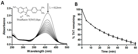 Thioflavin T (ThT) dye degradation by a UV + H2O2 advanced oxidation process. (A) ultraviolet/visible (UV/Vis) absorbance spectra for ThT degradation by UV + H2O2. Concentration of ThT dye = 25 ppm, pH = 2, concentration of H2O2 = 1 mM. The UV/Vis scans were taken every 5 min; (B) Percentage of ThT remaining (decrease in absorbance at 412 nm) after treatment with UV + H2O2. Concentration of ThT dye = 25 ppm, pH = 2, concentration of H2O2 = 1 mM. Data shown is the average of triplicate measurements (± standard deviation (SD)).