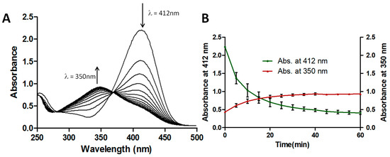 ThT dye degradation by Chloroperoxidase (CPO) + H2O2. (A) UV/Vis absorbance spectra for ThT dye degradation by CPO + H2O2. Concentration of ThT dye = 25 ppm, pH = 2, concentration of H2O2 = 1 mM, concentration of CPO = 10 nM. The UV/Vis scans were taken every 5 min; (B) Changes in absorbances at 412 nm and 350 nm of ThT dye after treatment with CPO + H2O2. Concentration of ThT dye = 25 ppm, pH = 2, concentration of H2O2 = 1 mM, concentration of CPO = 10 nM. Data shown is the average of triplicate measurements (± SD).