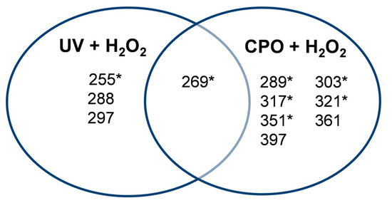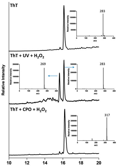 Detailed analyses of all the peaks detected after the UV + H2O2 and CPO + H2O2 treatments of ThT are shown in Table 1. As can be seen from this table, the AOP-mediated degradation of ThT (ThT + UV + H2O2) generated four intermediates with m/z values of 297, 288, 269, and 255, with the m/z = 269 peak being the most prominent intermediate (based on peak area). Interestingly, the intermediates produced during the enzymatic treatment of ThT (ThT + CPO + H2O2) were very different, with m/z values of 397, 361, 351, 321, 317, 303, 289, and 269. It is worth noticing that except for the m/z = 269 species, the two different treatments produced completely different intermediates. This interesting and novel finding is also graphically represented in Figure 4.