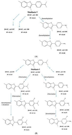 (A) Proposed structures of some of the intermediates generated during the UV + H2O2-based degradation of ThT dye; (B) Proposed structures of some of the intermediates generated during the CPO + H2O2-based degradation of ThT dye. RT: retention time.