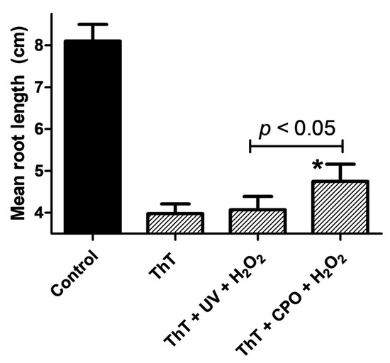 The toxicity of degradation products should be analyzed where possible, as they can often be more toxic than the parent compound [45]. Therefore, we carried out phytotoxicity studies using Lactuca sativa seeds by exposing them to AOP-remediated ThT and enzymatically treated ThT solutions. The germination of Lactuca sativa L. var. Buttercrunch seeds is a standard protocol for assessing toxicity in water and soil matrices, and is recommended for bioassays by the U.S. Environmental Protection Agency, the Food and Drug Administration, and the Organization for Economic Cooperation and Development [46]. Figure 7 shows the results of the toxicity studies, in which the root lengths of L. sativa seeds exposed to distilled water (control), neat ThT, ThT treated with UV + H2O2, or ThT treated with CPO + H2O2 were measured. As can be seen from the figure, ThT had a significant phytotoxic effect on the seeds, causing a dramatic and significant decrease in the mean root length. A significant inhibition of root lengths was also observed in the ThT + UV + H2O2 and ThT + CPO + H2O2 samples (Figure 7). However, a t-test analysis showed that the ThT + CPO + H2O2 sample was significantly (p < 0.05) less toxic than the ThT + UV + H2O2 sample. This result was quite unexpected, and suggests that one or more of the intermediates generated during the UV + H2O2 treatment of ThT could be toxic. Alternatively, the fact that the ThT + CPO + H2O2 sample still exhibited significant phytotoxicity could be explained by the fact that this sample still contained large amounts of the toxic undegraded ThT dye. Further studies will need to be carried out to allow the nature of the phytotoxicity of the ThT + UV + H2O2 sample to be understood; however, the present data shows that the UV + H2O2 and CPO + H2O2 treatments of ThT produce different intermediates that could have differing toxicities: an observation that has not been published earlier.
