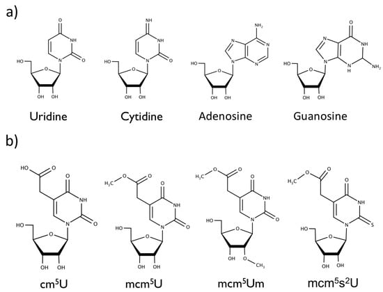 Chemical structures of the (a) canonical nucleosides uridine, cytidine, adenosine, guanosine, and (b) modifications to wobble uridine 34 in the anticodon stem loop, 5-carbonyl-methyluridine (cm5U), 5-methoxycarbonyl-methyluridine (mcm5U), 5-methoxycarbonyl-2′-O-methyluridine (mcm5Um), and 5-methylcarboxymethyl-2-thiouridine (mcm5s2U).