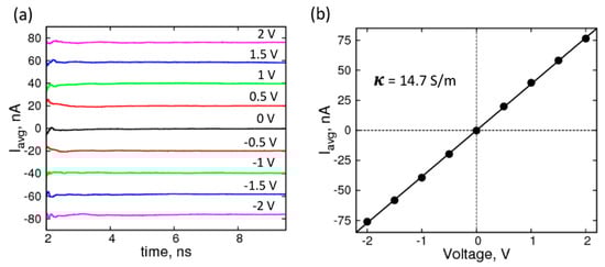 Characterization of the electrolyte (1 M KCl): (a) Average current profiles of simulation system with no graphene under forward and reverse biases of ±2 V (magenta), ±1.5 V (blue), ±1 V (green), ±0.5 V (red), 0 V (black); (b) I-V curve for the corresponding system with a straight-line fit yielding a conductivity (κ) of 14.7 S/m.