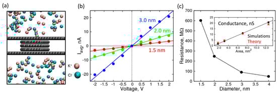 where, n is the total number of K+ and Cl− ions, Lz is the box-length in the direction (Z) of the applied voltage, qi is the columbic charge, and z(t) is the z-coordinate of the ions at time, t. The running averages of the currents, shown in Figure 2a, plateau well within the simulation timescale, indicating equilibration; and are therefore expected to remain unchanged if the simulations were extended. The average currents (Figure 2b) plotted against voltages yields an I–V curve that can be fit to a straight line to obtain resistance and conductance values. The molar conductivity of 1.0 M KCl solution for our system was 14.7 mS·m2· mol−1, which is 50% higher than the experimental value, is in good agreement with previous simulation studies, using different force-field parameter set and MD simulation package [47].