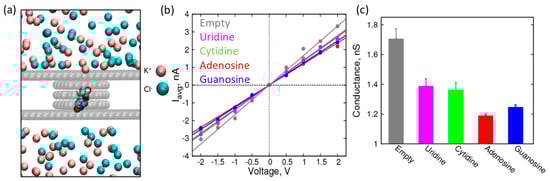 First, we performed simulations of canonical nucleosides and calculated the conductance of the pore when the nucleosides are localized to it (Figure 4b,c). The conductance values are derived from average currents shown in Figure S2. While all the nucleosides decrease the conductance of the nanopore by blocking the passage of ions, it is interesting to note that the purines have a distinctly higher increase in resistance compared to the pyrimidines. This observation is consistent with the size of the nucleosides: the purines have larger ring structures, which expectedly have a larger steric effect compared to the pyrimidines [2,50]. Furthermore, among the purines (or pyrimidines), the differences in the conductance values are significant (outside the error bars) to resolve their identity (adenosine vs. guanosine and uridine vs. cytidine). This difference in conductance (or ionic current) is already being exploited for nanopore-based sequencing of DNA oligonucleotides (MinION, Oxford Nanopores Technologies, Oxford, UK). However, to accurately predict the change in ionic current while an oligonucleotide is translocating through the pore, we need more sophisticated simulations of oligonucleotides. Nevertheless, this study on localized nucleosides provides a good starting point to assess the feasibility of detection of nucleosides based on changes in ionic current or pore conductance.
