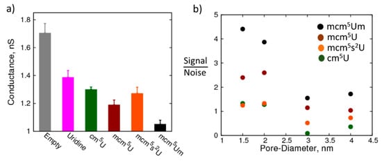 The following are available online at www.mdpi.com/2218-273X/7/3/65/s1, Figure S1: Average current profiles of empty pores derived from 10 ns trajectories, Figure S2: Average current profiles of single canonical nucleosides derived from 40 ns trajectories in 1.5 nm pore, Figure S3: Average current profiles of single modified and unmodified uridines derived from 40 ns trajectories in 1.5 nm pore.
