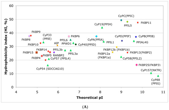 In Figure 4A is shown a distribution of the overall HIs of twenty human cyclophilins and fifteen FKBPs versus the theoretical pIs whereas in Figure 4B is shown a distribution of the nominal masses versus the pIs. Human CyPA (hCyPA) has a nominal mass of about 18 kDa and its multiple small size paralogues are expressed in diverse cells. For example, the archetypal hCyPA (blue diamond) has at least twelve small size paralogues, which are the components of spliceosomal complexes (light green triangles) [8,48]. Large cyclophilins (30 to 360 kDa) are fusion proteins that contain one PPIase domain and various combinations of other domains such as RNA-recognition domain (RRM), TPR, serine/arginine (SR)-rich domain, WD40 domain, leucine-rich (LR) domain, etc. (reviewed in [8]). Three cyclophilins are very hydrophobic proteins (blue circles), which reside in the ER (CyPB) [20], membranes (CyPC), and mitochondrial membranes (CyPD) [8].