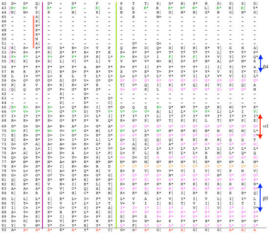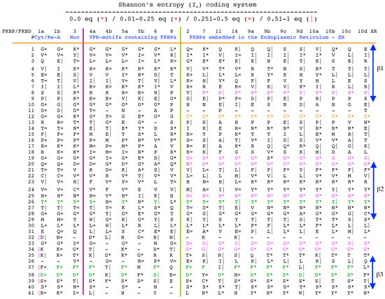 Vertical sequence alignment of the FKBDs from human FKBPs with Shannon’s entropy. Twenty-one FKBDs from human FKBPs formatted as a VO_MSA. The FKBDs from hFKBP15 and AIP were excluded from this MSA since they have a poor overlap (outliers) with the ensemble of shown sequences.