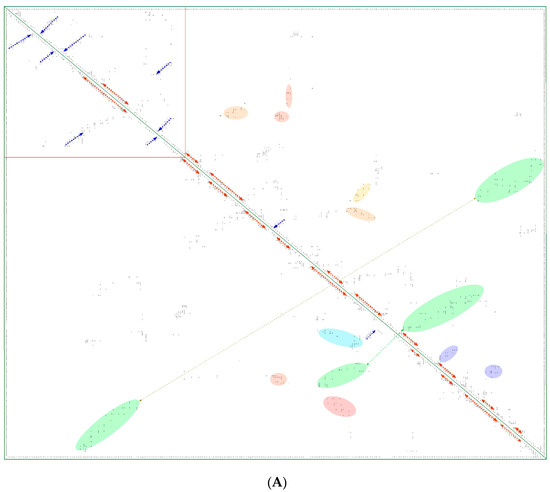 In Figure 8A is shown a 2D map of the IMICs calculated from the X-ray structures of the kinase domains from ribosomal protein S6 kinase beta-1 (S6K1) [71] (upper triangle) and mTOR [66] (lower triangle). In Figure 8B are shown the X-ray structures of S6K1 (upper panel) and a large fragment of mTOR containing rapamycin-binding domain (RBD; lower panel). Both proteins belong to AGC family but their sequences are highly dissimilar (ID = 6%). S6K1 (aka STKc-p70S6k) is one of the downstream components interacting with mTOR. Despite low sequence similarity, several IMICs have similar distributions in both triangles of the 2D map, which indicates that the major spatial features are well conserved in both domains. For example, the IMICs in the N-terminal lobes, which are shown at the left upper corner of the figure that was designated in the red box, correspond to two sets of anti-parallel β-sheets (blue arrows) that are followed by a long α-helix (orange arrow) and two sets of anti-parallel β-sheets. Even if the alignment of the α-helices in the C-lobes is imperfect, several groups of the IMICs, which were colored as green/blue ellipsoids linked via dotted arrows, have similar positions in both triangles. Several groups of the IMICs that are indicated as red and violet ellipsoids however are unique spatial features of each domain. A large-size format of Figure 8A is given in Supplementary Materials.