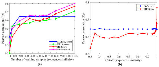 Li and Yang published a study [9] intended to analyse how the use of highly similar proteins impacts the performance of SFs. More precisely, highly similar proteins were training complexes whose proteins were highly similar to those in the test complexes. The issue was investigated for classical and machine-learning SFs [8], with X-Score [10] as the classical SF and the first version of random forest (RF)-based RF-Score [1] as the machine-learning SF. They focused on the ability of these SFs to predict the binding affinities of the test protein–ligand complexes from their crystal structures (also known as their scoring power) using a common benchmark [10]. Pearson correlation (Rp) between predicted and measured affinities of the test set complexes was used to assess the scoring power of the two SFs. Each SF was trained with a series of nested training sets, ranging from small sets of highly dissimilar proteins to large sets that also include highly similar proteins (each training set is a strict subset of any larger training set).