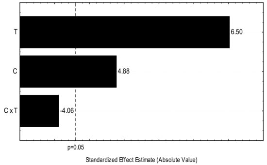 The Pareto graph is widely used to represent the significance of parameters and their interactions in experimental design. In Figure 1, the horizontal bars show the importance of the factors analyzed in descending order, so that any parameter that exceeds the dashed line is significant (temperature, acid concentration) for the xylose response variable. The interaction TC (temperature × acid concentration) was not significant. The model was statistically significant at a confidence level of 95%, and it was confirmed by the F-test (Table 2).