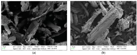 After the pre-treatment (Figure 3b), the outer layer of the fibers was removed and the more complex structure, which existed before, was cleaved, making the cellulose fibrillar structure visible. According to Lacerda et al. [], the gradual reduction in the sizes of the fibers is justified by the interaction of the acid in the lignocellulosic matrix. As a result, the fiber would be composed of smaller units, which makes it more susceptible to subsequent acid or enzymatic hydrolysis [].
