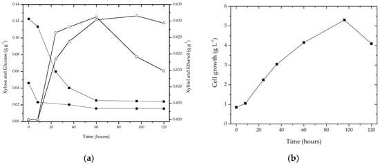 After 60 h of fermentation, the concentrations of xylitol and ethanol decreased (Figure 5a). According to Parajó et al. [], the yield factors of products are dependent on the regulation of carbon flux through metabolic pathways. At the moment the sugars become scarce, the microorganisms use the alcohols as a carbon source, reducing the concentration in the medium.
