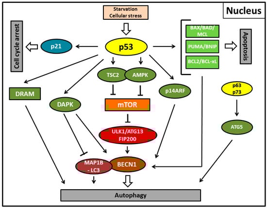 Autophagic regulation by nuclear transactivation—i.e., transcriptional upregulation of its downstream target genes by wild-type p53—in healthy and tumor cells occurs through several pathways in the classical canonical pathway (Figure 1, Table 1) []. These include the target genes TSC2 (tuberous sclerosis complex 2) and PTEN (phosphatase and tensin homolog), both of them being determined or presumed tumor suppressors, respectively, as well as the nutrient energy sensor AMP-activated protein kinase (AMPK) or sestrins 1 and 2 that are AMPK activators [,,,]. Further signaling of the autophagic process by these pro-autophagic factors is then mediated by mTOR inhibition as detailed in the previous chapter [,]. As a kind of shortcut and a direct mediator of autophagy and apoptosis, damage-regulated autophagy modulator (DRAM) can be upregulated by stress-activated p53 []. DRAM represents a lysosomal protein that can interfere with several different stages of autophagosome formation []. In addition, apoptosis-inducing proteins can be directly transactivated by p53 and are also implicated in activation of autophagy [,]. Here, downregulating the expression of BCL-2, BCL-xL, and MCL-1 or upregulating the expression of BAX, BAD, BNIP3, or PUMA releases Beclin-1 from its protein complex that initiates autophagy [].