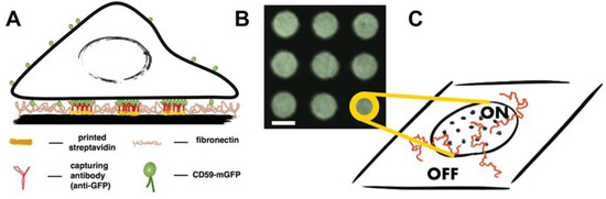 Microstructured surfaces were produced following a protocol described in [42]. Briefly, stamps featuring circular pillars with a diameter of 3 µm, center-to-center distance of 3 µm, and height of 2 µm were cleaned with absolute ethanol and dH2O, then incubated with 50 µg/mL streptavidin (AppliChem) in phosphate-buffered saline (PBS) (Sigma-Aldrich) for 15 min, rinsed with dH2O, and dried in a N2 flow. After drying, the stamp was placed on an epoxy-coated coverslip (Schott, Mainz, Germany) and incubated for 30 min at room temperature. After removal of the stamp, Secure-Seal hybridization chambers (Grace Biolabs, Bend, OR, USA) were placed on top of the structure and 10 µg/mL fibronectin (Sigma-Aldrich, Saint Louis, MO, USA) in PBS with 1% bovine serum albumin (BSA) (Sigma-Aldrich) was pipetted into the chamber. After 30 min incubation, the structures were rinsed with PBS and incubated with biotinylated GFP antibody (Novus, Littleton, CO, USA) at a concentration of 10 µg/mL in PBS with 1% BSA. After the antibody incubation, samples were rinsed thoroughly with PBS.
