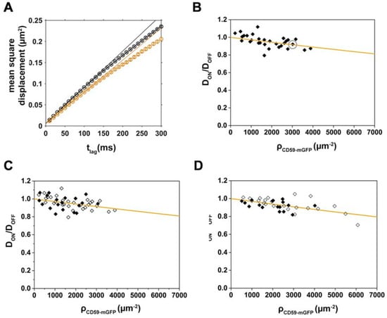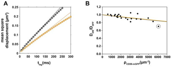 Mobility of the cholesterol analog Chol-PEG-KK114 decreases with increasing CD59-mGFP surface density. (A) Mean square displacements (msd) of “ON” (orange) and “OFF” (black) CD59-mGFPI areas are plotted as a function of tlag for one representative cell. Diffusion coefficients were determined by fitting the function msd = 4Dtlag + 4σxy2; (B) Relative diffusion coefficients DON/DOFF were determined for individual cells (N = 22), plotted as a function of CD59-mGFP density, ρCD59-mGFP, and fitted with Equation (2) (steric obstacles, orange line) or Equation (1) assuming a combined size of tracer and obstacle d = 2 nm (binding, dotted grey line). The gray circle indicates the cell shown in (A).