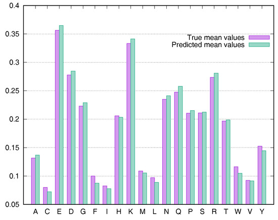 Comparison of true mean values and predicted mean values for 20 types of amino acids using the CB502 dataset.