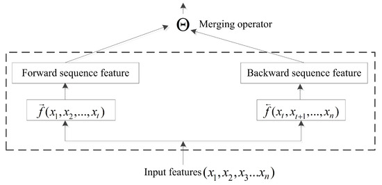 The BRNN structure is capable of efficiently learning sequence information [45]. Previous studies focused primarily on the BRNN methodology with little research on incorporating bidirectional-information merging. In a conventional neural network, pooling operations are computationally important, with the pooling layer responsible for accumulating convolutional results. The merging operator in a BRNN acts similarly to pooling operations. At time , input forwarded to the current node is represented by , and the backward input is represented by . Therefore, a common formula for the output of the current node is presented in Figure 4 and as follows:
