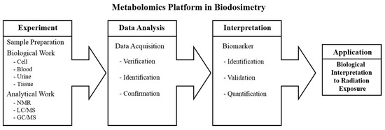 Radiation metabolomics operates with a workflow [19] starting from a biological question and experiment, proceeding through sample collection and preparation, analytical experiments to acquire data, data pre-processing and analysis followed by biological interpretation. This general process for conducting radiation metabolomics studies is displayed in the flow diagram in Figure 1.
