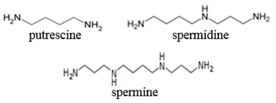 Biomarkers are biological characteristics that are objectively measured and evaluated as indicators of biological responses to radiation exposure. The search for biomarkers of effective dose and the early effects of ionization radiation exposure in both humans and experimental animals has a history spanning several decades. Biomarkers that can help identify exposed individuals are critically important in the event of mass casualty incidents. Metabolomics approaches for biomarkers allow the simultaneous, quantitative analysis of thousands of different metabolites within a given sample [25]. It aims at identifying unique fingerprints of specific disturbances such as example effects of exposure to radiation. Polyamines (putrescine, spermidine, and spermine) are aliphatic polycations present in all cells, where they have pleiotropic effects that allow their linkage to DNA, RNA, and proteins, for example, with a relevant regulatory role in a number of steps of cell metabolism. The putrescine, spermidine, and spermine from polyamines play a pivotal role in living organisms [26,27,28]. Polyamines are low molecular weight organic polycations displaying their important biological activities having mediated a multitude of in vivo processes. In general, the polycationic nature of polyamines is important for their biological activities and their in vivo interaction with multiple kinds of molecules such as polyanionic nucleic acids and proteins. The chemical structures are presented in Figure 2.