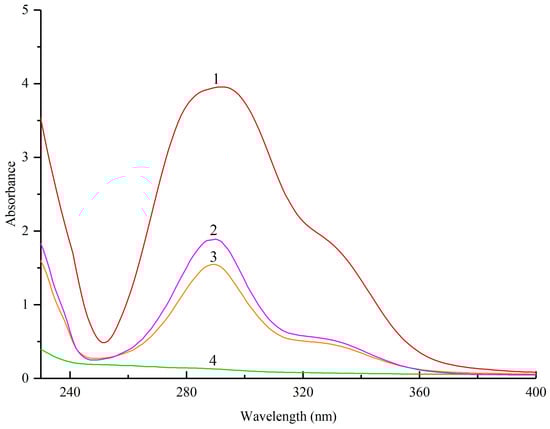 Ultraviolet (UV) spectra analysis of: (1) pinocembrin; (2) pinocembrin complex with lecithin; (3) physical mixture of pinocembrin and lecithin; (4) lecithin.