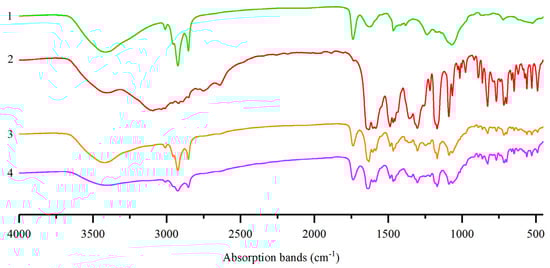 Infrared (IR) spectra analysis of: (1) lecithin; (2) pinocembrin; (3) physical mixture of pinocembrin and lecithin; (4) pinocembrin complex with lecithin.