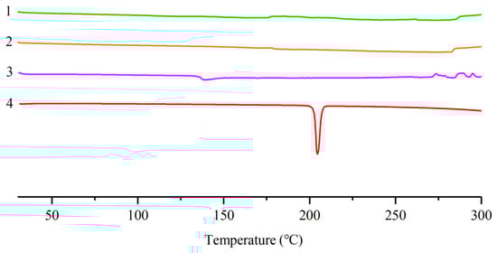 (1) Differential scanning calorimetry (DSC) curves of lecithin; (2) physical mixture of pinocembrin and lecithin; (3) pinocembrin complex with lecithin; (4) pinocembrin.