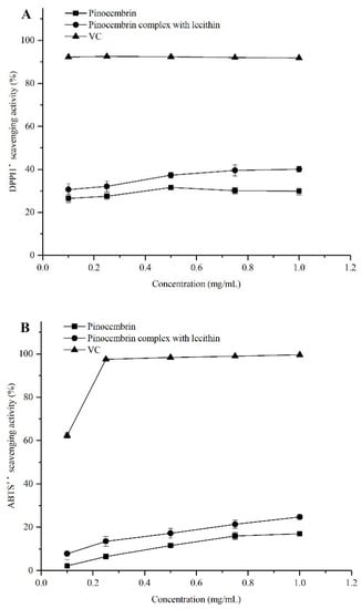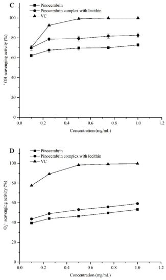 The antioxidant capabilities of pinocembrin and the pinocembrin–lecithin complex were evaluated by a series of assays (radical scavenging capacity for DPPH, ABTS, hydroxyl, and superoxide-anion), because of the difference in the antioxidant action mechanisms []. The results are shown in Figure 5. In all the antioxidant experiments, the antioxidant capacities of pinocembrin and its complex were weaker than those of ascorbic acid (VC) at all concentrations tested in this study. Nevertheless, the antioxidant activities of pinocembrin were improved by the complex with lecithin. There were significant differences in the antioxidation of the pinocembrin complex with lecithin among different antioxidant tests. At a concentration of 0.1 mg/mL, the hydroxyl radical scavenging effect of the pinocembrin–lecithin complex was nearly as good as that of VC, which were 69.96 ± 2.53% and 70.36 ± 0.92%, respectively; while it reached 82.44 ± 2.21%, only 17% lower than VC, and both were more effective than that of pinocembrin (72.83 ± 1.55%), at a concentration of 1.0 mg/mL. However, at 1.0 mg/mL, the ABTS radical scavenging ability of the pinocembrin–lecithin complex was just 24.73 ± 1.04%.