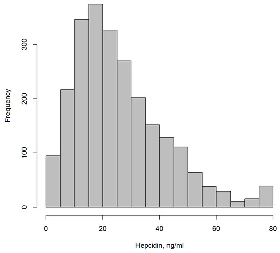 Distribution of hepcidin levels in the AtheroGene Study (n = 2198).