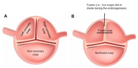 - Roberts, W.C. The congenitally bicuspid aortic valve: A study of 85 autopsy cases. Am. J. Cardiol. 1970, 26, 72–83. [Google Scholar] [CrossRef]
