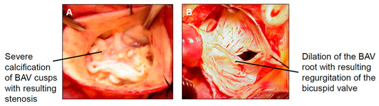 The most common clinical manifestation in BAV patients is the phenotype of BAV stenosis and the simultaneous asymmetrical dilation of the tubular ascending aorta. The common characteristics of this phenotype are a progressively calcific valvular stenosis, a mostly normal-sized sinus of the Valsalva segment, and asymmetrical dilatation of the tubular ascending aorta (Figure 4A). Most often, aortopathy is an incidental finding in BAV stenosis patients and remains in a stable condition over the long-term after an isolated surgical treatment of the aortic valve (i.e., without simultaneous aortic replacement) [22,29]. This aortic phenotype is supposed to be of predominantly hemodynamic genesis [30] that only very rarely shows a relevant progression after the isolated surgical correction of valvular stenosis.