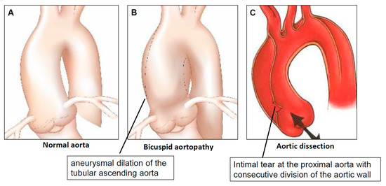 - Tadros, T.M.; Klein, M.D.; Shapira, O.M. Ascending aortic dilatation associated with bicuspid aortic valve. Pathophysiology, molecular biology and clinical implications. Circulation 2009, 119, 880–890. [Google Scholar] [CrossRef] [PubMed]