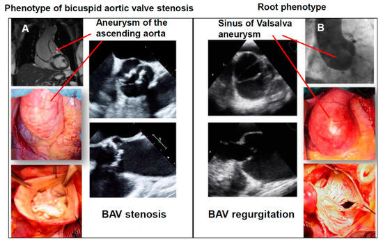 Clinical BAV Phenotypes. (A) BAV valvular stenosis with an asymmetric dilation of the tubular acending aorta; (B) root phenotype.
