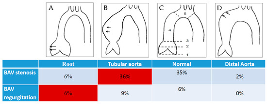 BAV is a highly heterogeneous disease. Previous studies identified two pathogenetically different BAV-associated valvulo-aortic phenotypes: (i) BAV stenosis with dilatation of the tubular ascending aorta and (ii) sinus of Valsalva dilatation with regurgitation of the BAV (root phenotype) [22,23,24]. There is some evidence that the severity of bicuspid aortopathy correlates with the respective phenotype of BAV [25]. In contrast to this finding, several prospective echocardiographic follow-up studies failed to show a significant association between BAV valve morphotype and the baseline aortic size as well as the progression rate of aortic dilatation [26,27]. Furthermore, longitudinal follow-up studies stressed the marked heterogeneity in the BAV aortopathy progression and the difficulty to discover fast progressors of aortopathy [27,28].