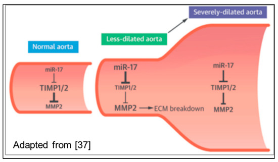 This hypothesis is supported by a recently published study [49], showing that dilation of the ascending aorta progresses through miR-17 over-expression at an early stage, leading to a decreasing TIMP1/2 activity and the subsequent activation of MMP2 (Figure 6).