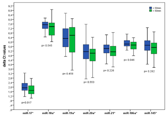 In a surgical cohort of BAV patients with aortopathy, an expression analysis of 7 circulating microRNAs (miR-17, miR-18a, miR-19a, miR-20a, miR-21, miR-106a, miR-145) showed differential levels of these microRNAs in patients with a severely-dilated (i.e., >50 mm diameter) vs. less-dilated (<50 mm diameter) proximal aorta (Figure 7). These results are in accordance with the findings by Wu et al. [48], who showed increased miR-17/miR-106a expression in an early stage of progressive aortic dilation.