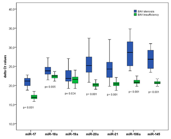 Furthermore, the expression of the 7 above mentioned microRNAs (miR-17, miR-18a, miR-19a, miR-20a, miR-21, miR-106a, miR-145) was significantly different in a BAV valvular stenosis (BAV-AS) vs. a BAV regurgitation (BAV-AR) population (Figure 8). All 7 investigated microRNAs were significantly downregulated in a subgroup of patients with BAV regurgitation (BAV-AR). BAV patients in the BAV-AR cohort had a significantly more severe bicuspid aortopathy, as the maximum aortic diameter was significantly increased (48 ± 9 mm in the BAV-AR cohort vs. 39 ± 12 mm in the BAV-AS cohort, p = 0.001).