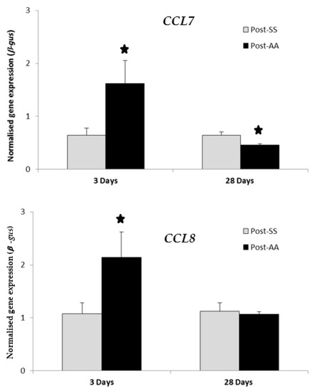 2.5. RT-PCR Expression Study of CCL7 and CCL8 Chemokines Three Days Post-AA and 28 Days Post-AA
