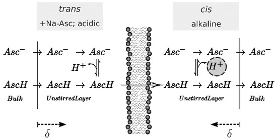 The pH profiles are not susceptible to the application of a transmembrane potential (Figure 3). This observation suggests that the ionic form does not permeate the membrane on a large scale. Otherwise, the anions that were driven by external voltage across the membrane would have affected the deprotonation of the also permeating AscH, that is, the equilibrium AscH concentration adjacent to the receiving interface would have increased simply because the concentration of increased. In turn, the transmembrane AscH concentration gradient would have diminished, resulting in a smaller flux and smaller pH profiles.