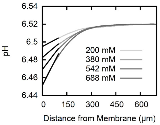 An AscH transmembrane concentration gradient gives rise to an acid flux. In turn, AscH dissociation in the receiving USL gives rise to a pH shift (Figure 2). We optimized the pH profile size by using (i) low buffer concentrations in both compartments, (ii) large Na-l-ascorbate concentrations in the cis compartment, and (iii) a transmembrane pH gradient. As described in Materials and Methods, we first found (Equation (10)) and subsequently fitted the set of differential equations (Equations (2)–(9)) to the pH profiles to obtain P. Both P and δ are listed in Table 2. The USL width reduces with an increasing AscH gradient. This effect can be attributed to an osmotic water flux [27] that builds up due to the asymmetric addition of AscH. The resulting convection is not taken into account in the numerical calculation, but acknowledging the different for the different gradients yields little variance in P ().