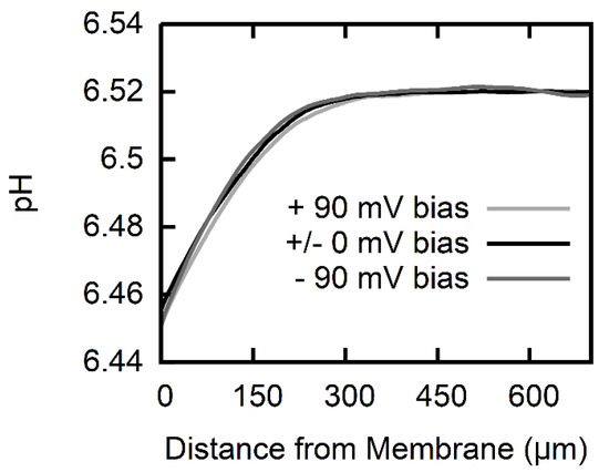 pH profiles at a constant AscH gradient (trace for 688 mM Na-l-ascorbate in Figure 2) under varying transmembrane voltage bias (black: no bias, light gray: +90 mV, dark gray: −90 mV). The pH profiles are independent of the applied transmembrane voltage within the borders of resolution which attributes the pH profiles to the permeation of a neutral species.