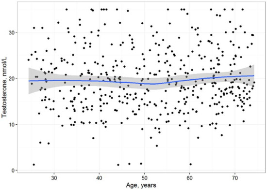 - Harman, S.M.; Metter, E.J.; Tobin, J.D.; Pearson, J.; Blackman, M.R. Longitudinal effects of aging on serum total and free testosterone levels in healthy men. Baltimore Longitudinal Study of Aging. J. Clin. Endocrinol. Metab. 2001, 86, 724–731. [Google Scholar] [CrossRef] [PubMed]