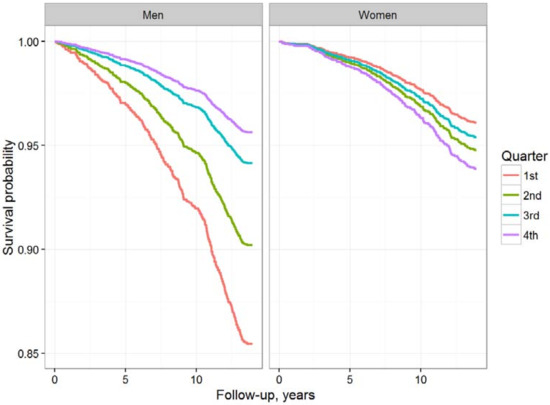 During a median follow-up of 13.8 years, a total of 599 incident type 2 diabetes cases (7.8%) were identified (363 male, 236 female). In men, Kaplan-Meier analyses showed a strong association of low testosterone levels with incident diabetes, while women at higher testosterone quarters were at higher risk for future type 2 diabetes (Figure 2). In accordance, basic (model 1) and fully adjusted (model 2) Cox regression analyses in men indicated 56% higher hazard of future diabetes in those with low testosterone levels (hazard ratio (HR) 1.56, 95% confidence interval (CI) 1.10–2.21, p = 0.01 for highest versus lowest quarter in the fully adjusted model) (Table 3). In women, basic adjusted Cox regression analysis, where age was used as the time scale, and only geographical region was adjusted for, indicated lower risk with low testosterone levels (HR 0.53, 95% CI 0.37–0.77, p = 0.001 for highest versus lowest quarter). This association lost its significance and became borderline non-significant upon additional adjustment for conventional cardiovascular risk factors, waist-hip-ratio, and time of blood draw (HR 0.72, 95% CI 0.49–1.05, p = 0.09 for highest versus lowest quarter).