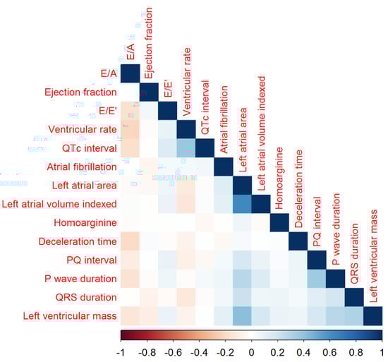 Figure 2. Kendall rank correlations between homoarginine, electrocardiographic and echocardiographic parameters, and atrial fibrillation (AF).