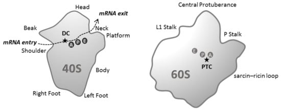 Schematic representation of the structural hallmarks and functional sites of the two mature ribosomal subunits (interface subunit view). The 40S subunit is organized in different structural regions: the body, the head, the shoulder, the beak, and the left and right feet. The 60S subunit structural landmarks are the central protuberance, the L1 and P stalks and the sarcin–ricin loop. Messenger RNA (mRNA) enters the mRNA channel through the mRNA entry site and exits through the mRNA exit site. The mRNA codon is read by its cognate transfer RNA (tRNA) in the decoding center (DC). The peptide bond formation occurs at peptidyl transferase center (PTC). The incoming aminoacyl tRNA enters in the A site, the P site holds the peptidyl tRNA, deacetylated tRNA binds the E site before it dissociates from the ribosome.